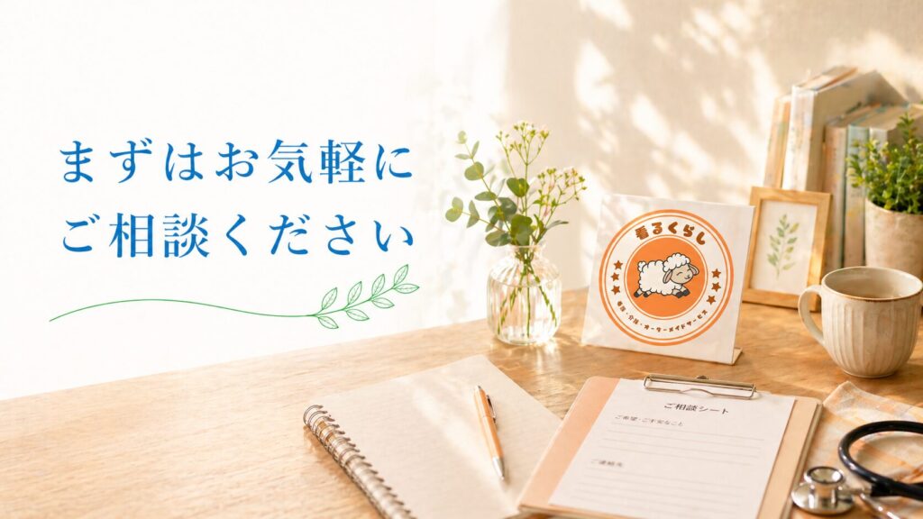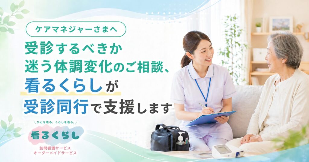 体調不安のご相談で「どこに相談すればよいかわからない」「ケアマネジャーさまだけでは抱えきれない」とお感じの際は、ぜひ看るくらしへご連絡ください。状態の整理から受診同行、外出支援まで、お一人おひとりのご状況に合わせて、必要な支援を一緒に考えてまいります。